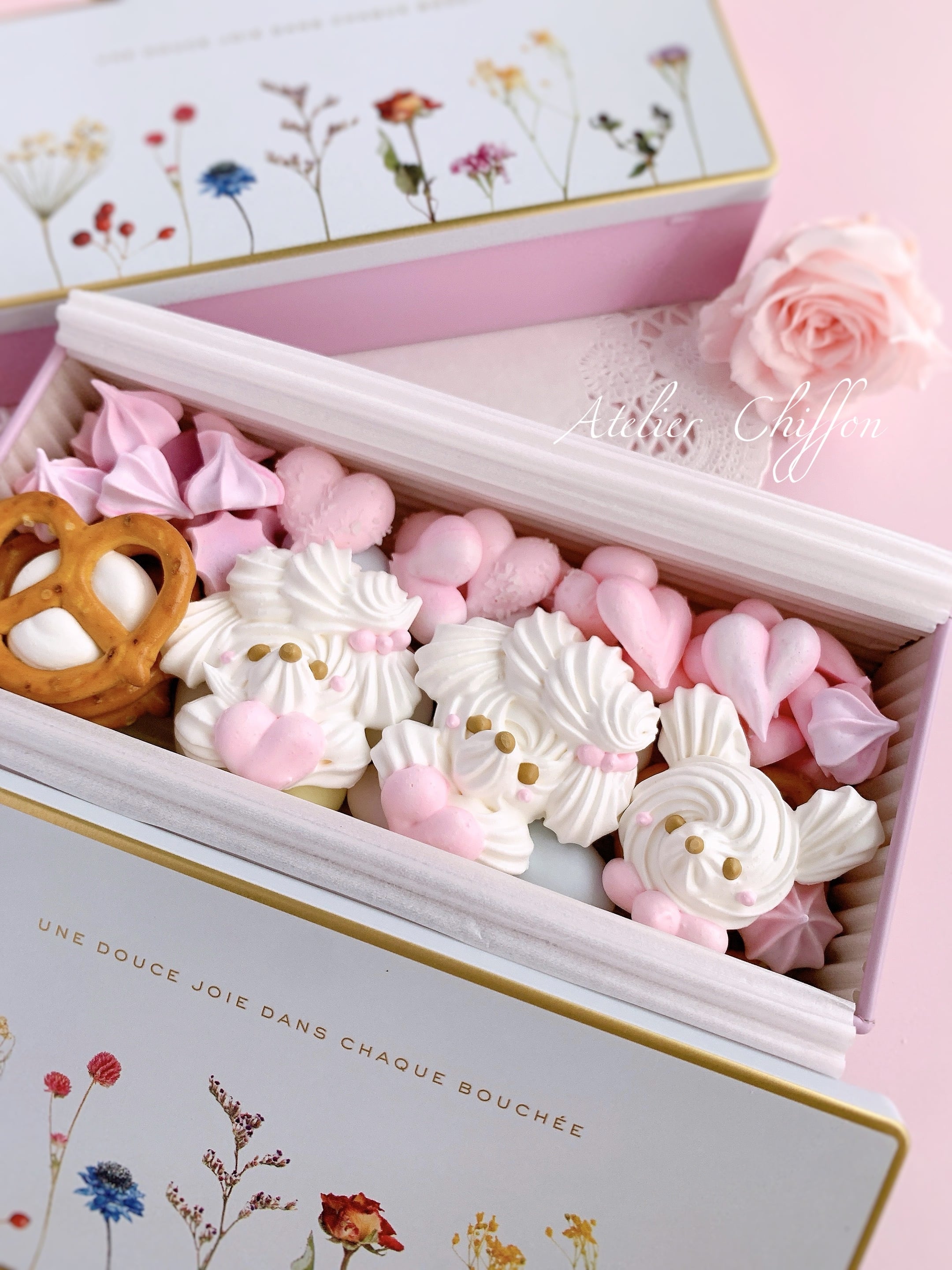 小さめの可愛い缶に詰めて、幸せメレンゲクッキー缶をお送りします♡